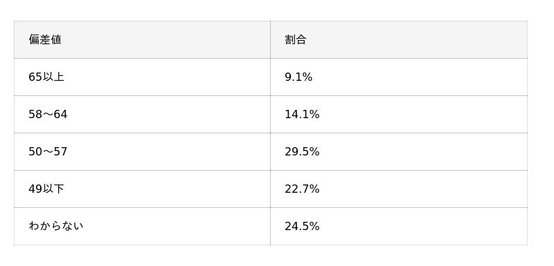 「塾なしでは、難関校への合格は難しいのではないか」という疑問に対しても、今回の調査は興味深いデータを示しています。お子様が合格した高校の偏差値を尋ねたところ、「偏差値50~57(29.5%)」が最も多いボリュームゾーンではあるものの、「偏差値58~64(14.1%)」「偏差値65以上(9.1%)」を合わせると、全体の23.2%、つまり約4人に1人が偏差値58以上の高校に合格していることが判明しました。