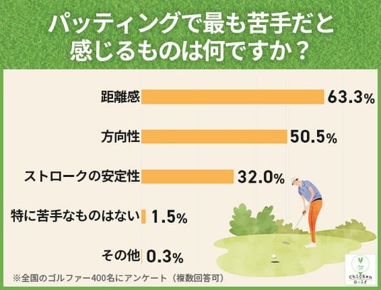 パッティングにおける技術的な課題として最も多かったのは「距離感」で63.3%(253人)、次いで「方向性」が50.5%(202人)でした。