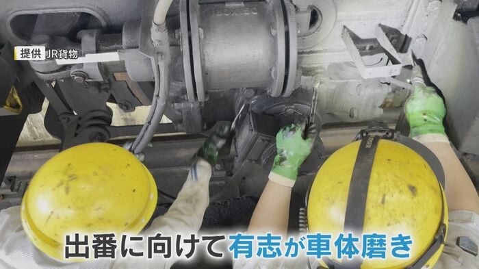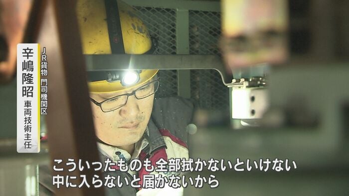 門司機関区では始業前や空き時間に有志が集まり、車体を隅々まで磨き上げた。「機関車って言ってみたら会社の看板みたいなものですから、汚い機関車を出す訳にはいかないんでですね」と辛嶋さんも整備に余念がない。