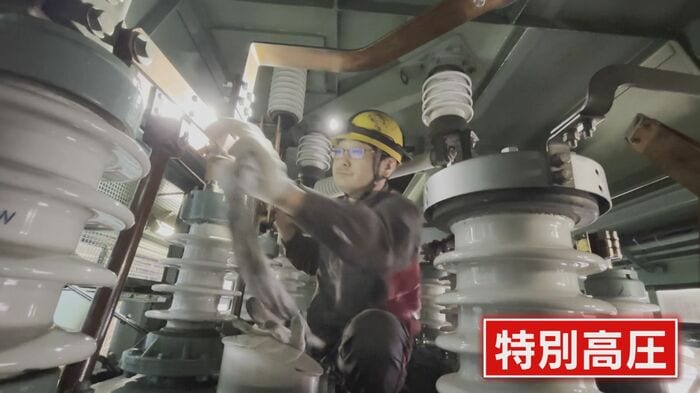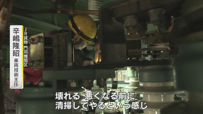 「私、“鳥籠”って言ってるんですけど、この中に入って整備します」と通称、鳥籠と呼ばれる狭い場所に入って碍子を磨くのは、この作業を取り仕切る車両技術主任の辛嶋隆昭さんだ。
