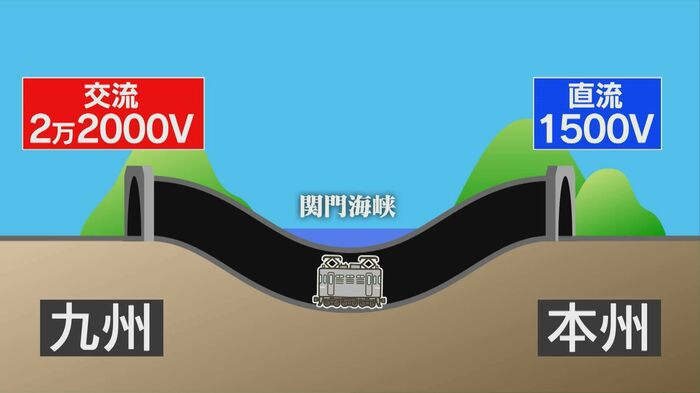 直流1500ボルトで電化された本州と、交流22000ボルトの九州との間をそのまま走破できる交直両用で、専ら関門トンネルを行き来するための機関車だ。海水による腐食を防ぐため車体はサビに強いステンレスで覆われている。