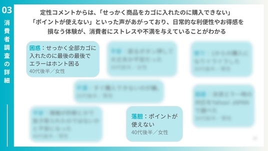 - 定性コメントからは、「せっかく商品をカゴに入れたのに購入できない」「ポイントが使えない」といった声があがっており、日常的な利便性やお得感を損なう体験が、消費者にストレスや不満を与えていることがわかる