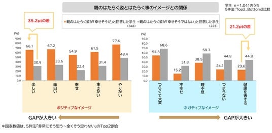 6. 親のはたらく姿と子どものはたらくイメージの関係:親のはたらく姿に対する子ども(学生)の印象と、学生のはたらくイメージ【ポジティブ/ネガティブ項目】との関連を分析した。結果、親が「幸せそうに見える」学生ほど、はたらく事へのポジティブなイメージを持っており、「幸せそうに見えない」学生ほどネガティブなイメージを持っていた。本分析は相関であり因果関係ではないものの、中でも「楽しい」は35.2ポイントの差が生じており、家庭内での親(就業者)の働く姿の印象が、子どもの労働観やキャリア観の形成に影響する可能性が示唆される。