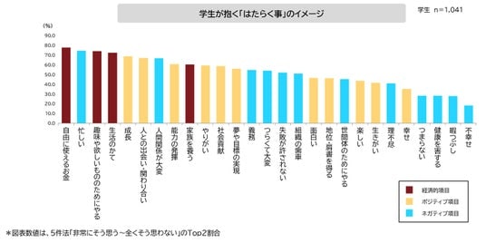 4. 学生(高校生・大学生ら)の「はたらく」事へのイメージは経済的要因が中心。「自由に使えるお金」「生活のかて」「趣味や欲しいもののため」が上位にあがった。