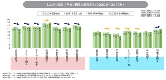 3. はたらく幸せ/不幸せ実感の7因子スコアで見ると、はたらく幸せ因子は「役割認識因子」(自分なりの役割を能動的に担っている実感が得られている)を除いて全般的に低下傾向にあり、不幸せ因子は「評価不満因子」(正当に評価されないと感じている)を除いて全般的にほぼ横ばい。