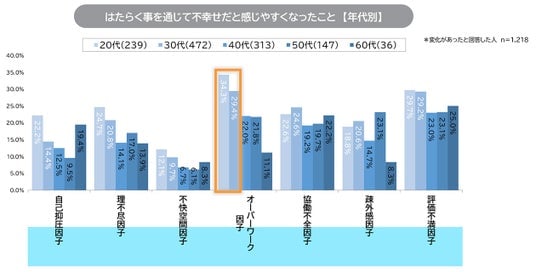 その結果、20代・30代では「オーバーワーク因子」をあげる割合が多く、次いで「評価不満因子」や「理不尽因子」などがあがった。「評価不満因子」は40代以降でも上位にあがるが、50代では「疎外感因子」も同列で上位にあがる。60代は、「評価不満因子」や「自己抑圧因子」といった能力発揮機会と評価に意識が向く傾向が見られる。