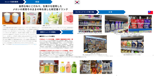 飲料を含めた食トレンドは、国ごとに独立して発生するのではなく、SNSや動画配信サイトにより“横に広がる”傾向が強まっています。欧米のトレンドが韓国に入り、韓国からアジア各国に広がるケースも多くあります。アジアの飲料トレンドを“横”でみることができる、レポートのコンテンツを紹介します。