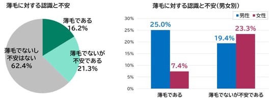 「薄毛である」と認識している人の割合は2割に満たないものの、将来への不安を持つ層が2割を超えていることが特徴です。特に女性では不安を持つ人の割合が高く、潜在市場の大きさがうかがえます。