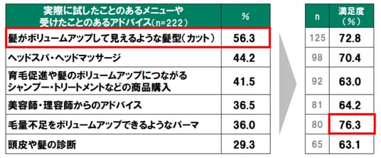 各メニューの満足度は、「毛量不足をボリュームアップできるようなパーマ」が76.3%と最も高く、次いで「髪がボリュームアップして見えるような髪型(カット)」(72.8%)、「ヘッドスパ・ヘッドマッサージ」(70.4%)と続いた。実際に試したメニューや受けたアドバイスは、サロンならではの高い価値を感じさせる結果となった。