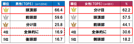 女性は特に「分け目」を意識<薄毛が気になる部位>