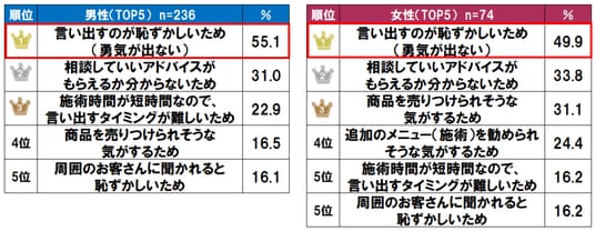情報源は、男女ともに「インターネット検索」は4割台、「TV・ラジオのCM」は約3割で上位である。女性では「美容師・理容師に相談する」が2割弱となった。一方、理美容室で相談できていない理由としては「言い出すのが恥ずかしいため」が男女ともに5割前後で最も高かった。