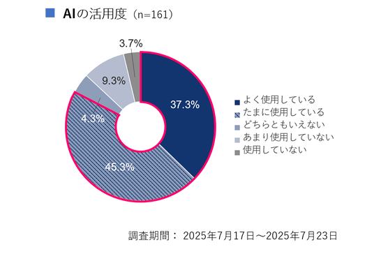 AIの活用度に関する調査では、AIを「よく使用している」と回答した学生が37.3%、「たまに使用している」は45.3%で、8割を超える学生がAIを日常的に利用していることがわかりました。