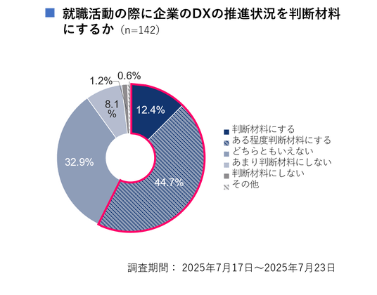 就職活動の際に企業のDXの推進状況を判断材料にするかという調査では、「判断材料にする」(12.4%)と「ある程度判断材料にする」(44.7%)を合わせた57.1%の学生が判断材料にするとの結果が得られました。学生側からの視点として、DXを推進しているかどうかが企業を選ぶ際の重要な視点のひとつとなっていることがわかります。
