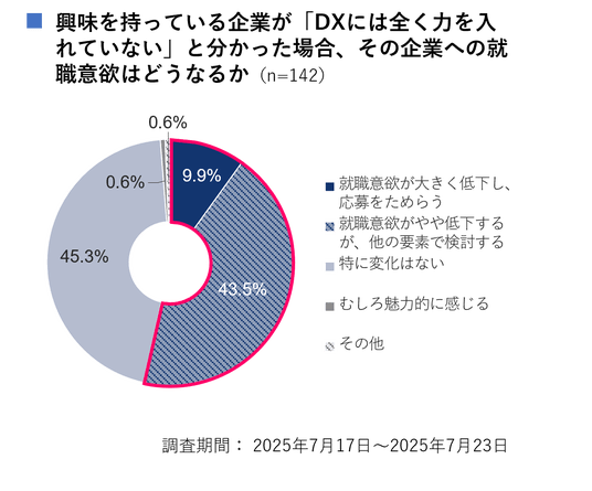 さらに、興味を持っている企業が「DXには全く力を入れていない」と分かった場合、その企業への就職意欲はどのように変化するかを問う設問では、最も多かった結果は「就職意欲がやや低下するが、他の要素で検討する」が43.5%、 「就職意欲が大きく低下し、応募をためらう」を選択した学生は9.9%と半数以上の学生の就職意欲が低下するという結果となりました。