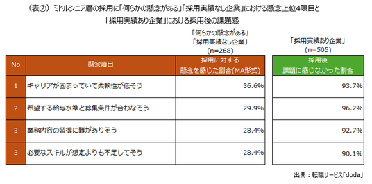 2024年度以降にミドルシニア層の採用実績がなく、今後も採用ニーズがない「採用実績なし企業」に対し、ミドルシニア層採用に対する懸念有無を聞いたところ、「何らかの懸念がある」と回答した割合は82.5%でした(図3.)。「何らかの懸念がある」と回答した268人に具体的な懸念点を聞くと、上位4項目には「キャリアが固まっていて柔軟性が低そう」「希望する給与水準と募集条件が合わなそう」、同率で「業務内容の習得に難がありそう」「必要なスキルが想定よりも不足してそう」が挙げられました。(表2.)