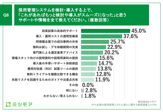 「Q8.採用管理システムを検討・導入する上で、『これがあればもっと検討や導入がスムーズになった』と思うサポートや情報をすべて教えてください。(複数回答)」(n=109)と質問したところ、「効果試算の具体的サポート」が45.0%、「導入・運用コストの透明性確保」が37.6%、「同規模企業での成功事例の共有」が25.7%という回答となりました。