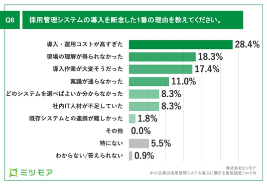 「Q6.採用管理システムの導入を断念した1番の理由を教えてください。」(n=109)と質問したところ、「導入・運用コストが高すぎた」が28.4%、「現場の理解が得られなかった」が18.3%、「導入作業が大変そうだった」が17.4%という回答となりました。