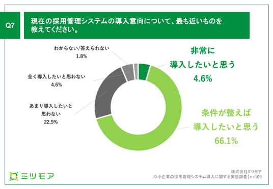 「Q7.現在の採用管理システムの導入意向について、最も近いものを教えてください。」(n=109)と質問したところ、「非常に導入したいと思う」が4.6%、「条件が整えば導入したいと思う」が66.1%と、7割以上が一度は断念したが、コストや体制といった障壁さえ解消されれば、導入を前向きに考えている企業が多いことがわかりました。