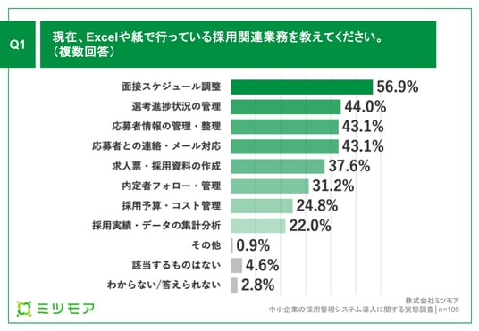 「Q1.現在、Excelや紙で行っている採用関連業務を教えてください。(複数回答)」(n=109)と質問したところ、「面接スケジュール調整」が56.9%、「選考進捗状況の管理」が44.0%という回答となりました。