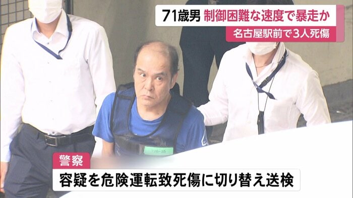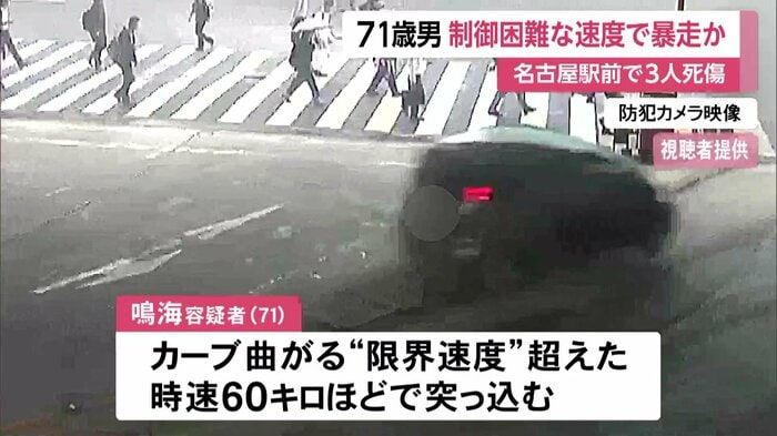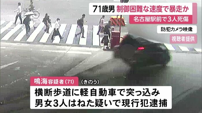 職業不詳の鳴海洋容疑者(71)は15日、名古屋駅近くの横断歩道に軽自動車で突っ込み、男女3人をはねた過失運転致傷の現行犯で逮捕された。