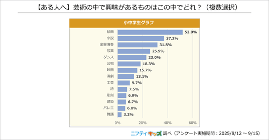 「芸術について興味がある」と回答した小中学生は86.1%で、最も人気な芸術ジャンルは「絵画」でした。
