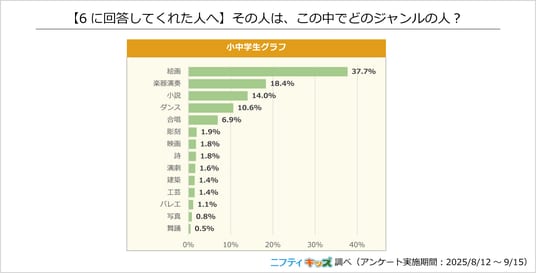 芸術カテゴリに含まれるさまざまなジャンルの中で、最も多く選ばれた選択肢は「絵画」でした。また、「小説」「楽器演奏」「写真」「ダンス」も上位となりました。