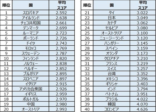 日本は、ESG Ranking平均スコア算出の主要40カ国(ESG Ranking10万件以上)のうち、20位オーストリア、21位タイに続く22位と中位だった。世界の1位はスロバキア、2位アイルランド、3位チェコで、上位は東欧、北欧が中心になっている。