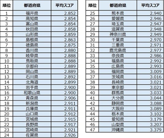 都道府県別では、1位福井県、2位高知県、3位富山県だった。大都市圏は、東京都が39位、大阪府が43位、愛知県は45位と軒並み下位にとどまった。