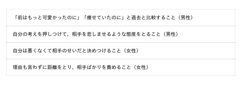とくに「前はもっと〇〇だったのに」と過去と比べたり、理由を言わずに距離を置いたりすると恋人を傷つける可能性が高いです。