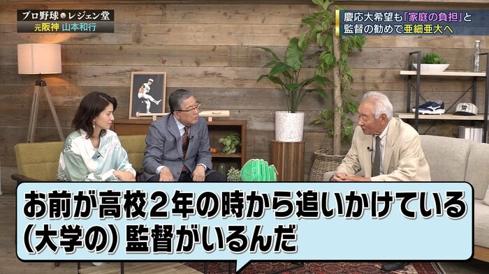 オープン戦で、早稲田と早慶戦が広島のところでやったのを見に行ったんです。試合やってる時に、野球のやり方を見てると、「慶応の方がいい」と思って、「慶応に行きたい」という、学校の監督さんと指導で話をしたんですよね。そうすると、やっぱり家庭の事情でね、「いやそれよりかお前は高校2年生の時から、ずっと追っかけてる(大学の)監督さんがおるんだ」と。「そこに行ったらいろいろ援助もしてくれるし、家庭にも負担かけないで済むから。また新しい大学を有名にしたらどうだ」っていうんで、亜細亜大学に決まったんです。