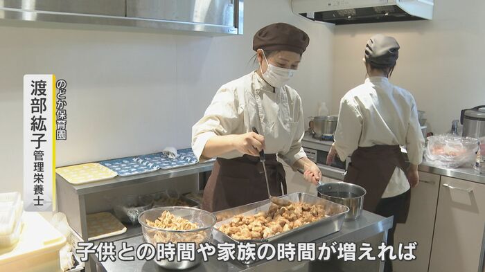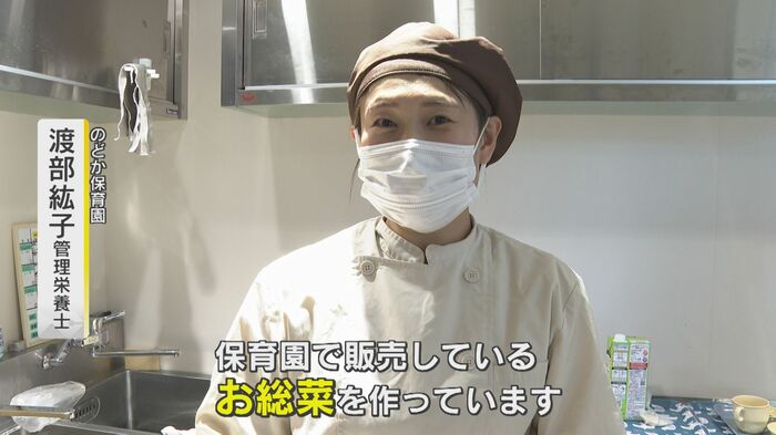 給食の時間を終えた午後1時過ぎ。給食室では、まだ調理が続いていた。「保育園で販売している夕食用のお総菜を作っています」と話すのは、『のどか保育園』で管理栄養士を務める渡部紘子さん。