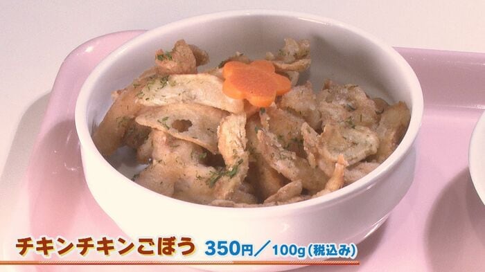 この日の献立は、給食でも人気のごぼうチップスと鶏肉を合わせた『チキンチキンごぼう』(350円/100g 税込み)と国産シラスとわかめが入った野菜たっぷりの甘酢サラダ(200円/70g 税込み)。