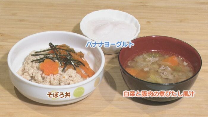 この日のメニューは、そぼろ丼など3品。保育園に所属する管理栄養士が、子供達の成長や発達に合わせた献立を考え、手作りの給食を提供している。