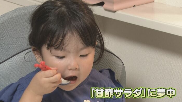 「いただきます!」普段からあまり野菜を食べないという玲奈ちゃんも夢中で『甘酢サラダ』を口に運ぶ。「おいしい」とニッコリ笑顔の玲奈ちゃん。