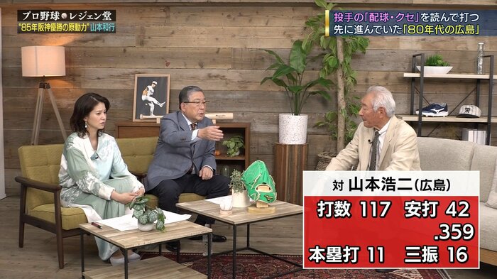 見抜かれていたんですね。山本浩二さん、なんと「.359」。3割5分9厘打ってるんですよね。山本さんに対しまして(対山本浩二:打数117・安打42・打率.359・本塁打11・三振16)。