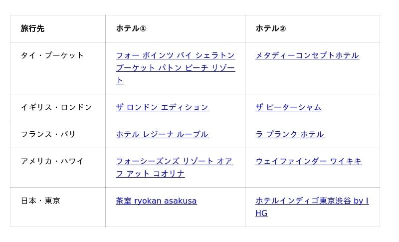 <ホテルホッピングにおすすめの旅行先とホテル>