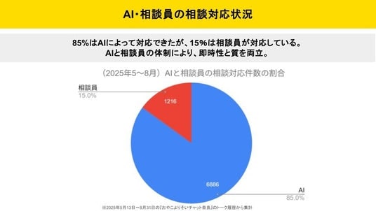 奈良市とつながりAI株式会社・認定NPO法人フローレンスが実証実験として運用する「おやこよりそいチャット奈良」は、導入後の運用実績分析により、相談の85%をAI、15%は相談員が対応。AIが多くの利用者に初期対応や情報提供を実施できた一方、人との相談を希望する利用者や一部の重篤・複雑なケースについては相談員による迅速な介入と継続支援が必要であり、AIと人によるハイブリッドでの相談支援体制が不可欠であることが明らかになりました。