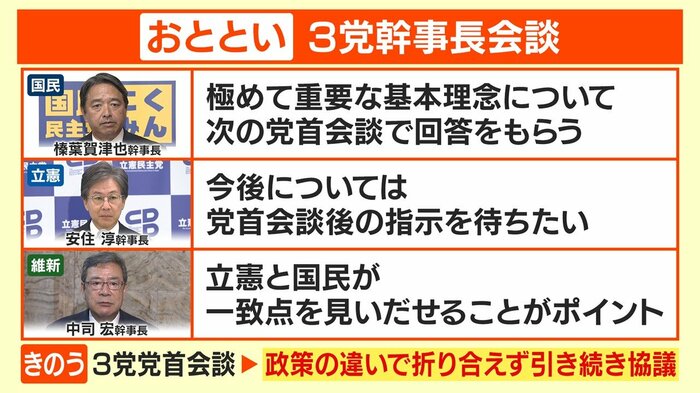 ええ、きのう(15日)3党協議を4時からやったあとに、きょう(16日)も幹事長・国対委員長間で調整をしていく、協議を続けると確認をしましたし、そこに出席していた維新の藤田共同代表もそのことに合意をしていますので、引き続き協議をしていきます。