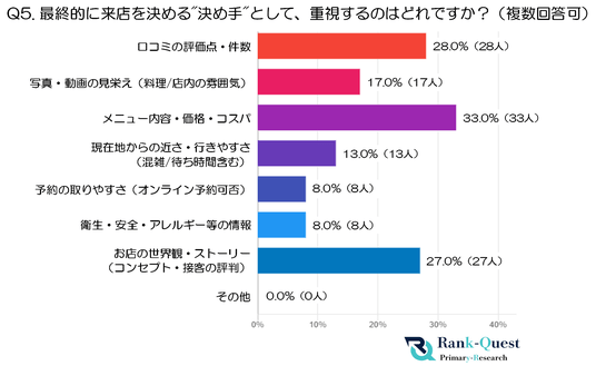 - 最も多かったのは「メニュー内容・価格・コスパ」で33.0%(33人)でした。最終的な来店決定においては“味や雰囲気”以上に費用対効果を重視する姿勢が強く、20代らしいコスト感覚が表れていると考えられます。