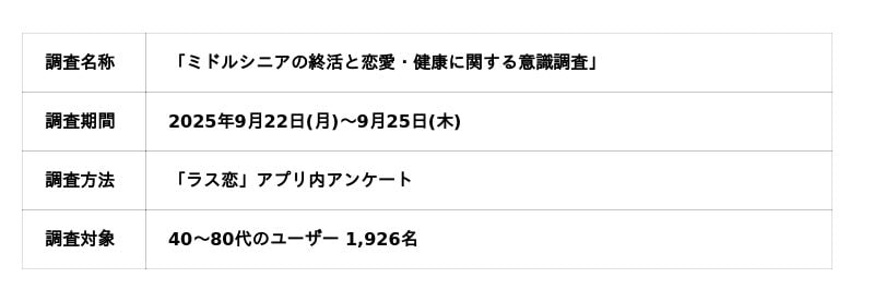 株式会社ラス恋(アイザックグループ/本社 : 東京都渋谷区/代表取締役CEO : 山口 昂星)が運営する、対象年齢が40歳以上の恋活・婚活マッチングアプリ「ラス恋」は、40~80代の「ラス恋」ユーザー1,926名を対象に「恋愛と健康寿命」に関する意識調査を実施しました。