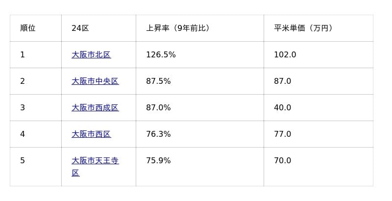 大阪市価格上昇率ランキング(2025年9月時点)