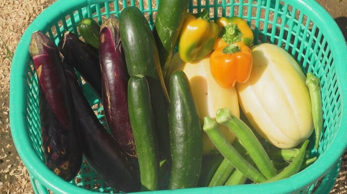 「これくらい大きくなっても柔らかいんですよね」とひとみさんが手に取るのは立派なオクラ。「長ナスおおきいの。里いもなんですけど…その日の朝に採ったのね、すぐ使ったりしてるから新鮮です」と話す。