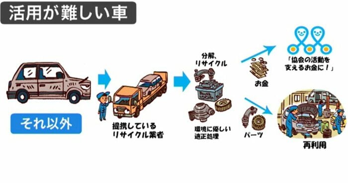 一方、すぐに活用するための条件を満たさないそれ以外の車でも、提携先の業者を通じて分解・リサイクルすることで金属材料を現金化するなどして、協会の活動資金する予定だ。