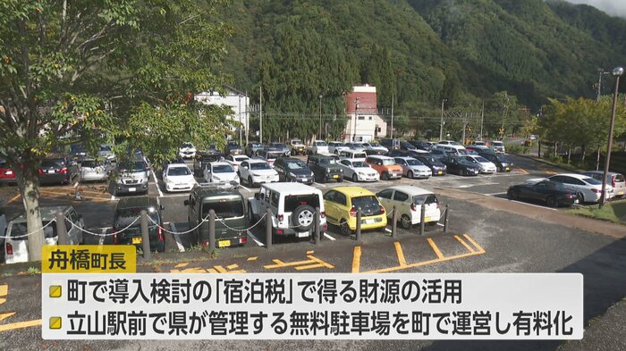 観光客からの運賃値上げ以外にも、町では今後導入を検討する宿泊税で得た財源の活用や、現在県が管理する立山駅前の無料駐車場を町で運営し有料化することで財源を確保するなど、複数の方策を提案する予定だ。