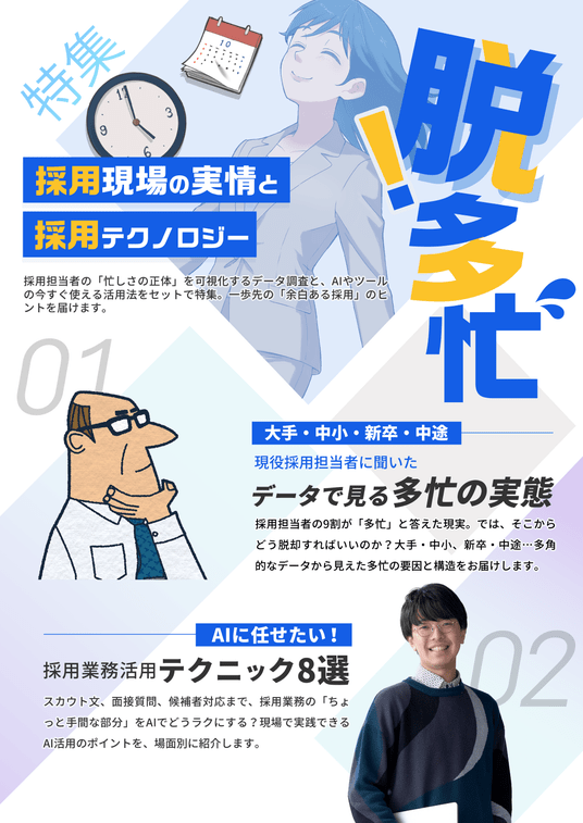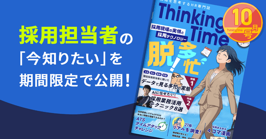 「Thinking Time」は、採用マーケットの最新トレンドや、現場で役立つ実践的なノウハウをお届けする情報コンテンツです。Thinkings株式会社の編集チームが独自取材を行い、信頼性の高い情報を発信しています。2025年10月号では、採用担当者500名への「忙しさ」に関するアンケート調査結果や、採用業務におけるAI活用法など、採用担当者が「今知りたい」情報をまとめた、5つのコンテンツを掲載しています。Thinking Time(2025年10月号)の概要