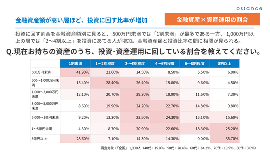 投資に回す割合を金融資産額別に見ると、 500万円未満では「1割未満」が最多である一方、 1,000万円以上の層では「2~4割以上」を投資にあてる人が増加。金融資産額と投資比率の間に相関が見られる。