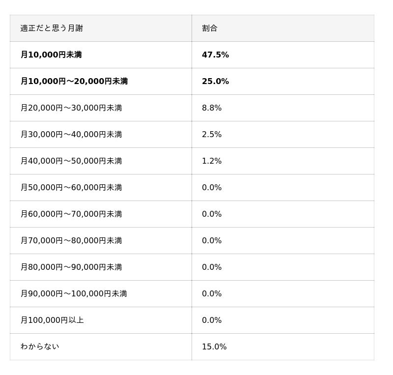「高校受験に向けた中学3年時の塾や家庭教師の月謝はいくらが適正だと思いますか?」という質問に対し、最も多かった回答は「月10,000円未満」で、全体の47.5%を占めました。次いで「月10,000円~20,000円未満」が25.0%となり、合計72.5%もの保護者が「月謝2万円未満」を適正価格と考えていることが明らかになりました。