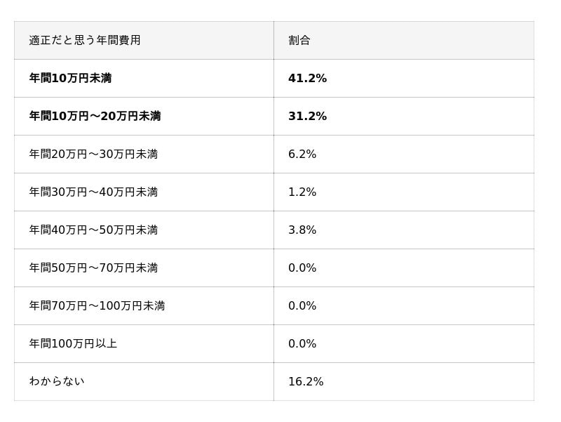 次に、「中学3年時の塾や家庭教師の年間費用(月謝+季節講習・特別講習等すべて含む)はいくらが適正だと思いますか?」という質問では、「年間10万円未満」(41.2%)と「年間10万円~20万円未満」(31.2%)を合わせ、72.4%の保護者が「年間20万円未満」を適正と考えていることが判明しました。