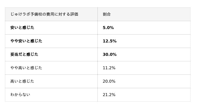 >塾・家庭教師利用者からの【じゅけラボの費用に対する評価】の調査結果