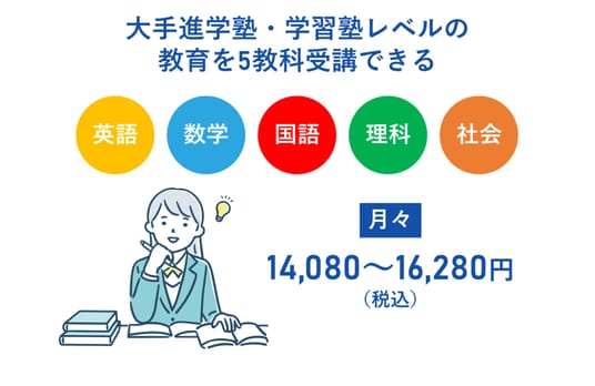 第一志望高校合格へ向けて早いうちから進学塾や個別指導塾を利用する場合、中学生の保護者にとって、高額になりがちな教育費は避けて通れない大きな負担の一つ。しかし、じゅけラボ予備校なら、大手進学塾や個別指導塾と同等の教育内容を5教科全て受講して、月額14,080円~16,280円で提供できます。高い教育品質を求める生徒や保護者、特に自宅学習を効率的且つ効果的に進めていきたい中学生にとって画期的な選択肢となり得ます。